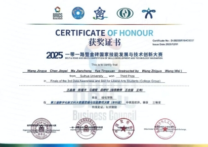 11月30日,2025一带一路暨金砖国家技能发展与技术创新大赛第三届数字化新文科大数据思维与技能赛项决赛顺利落下帷幕。在此项高水平赛事中,经济管理学院派出的参赛队伍表现卓越,凭借其扎实的专业知识、出色的数据分析能力与积极的实战协作精神,在激烈的竞争中奋勇拼搏,最终由财务管理专业学生高龙、王晶雅分别带领的两支队伍脱颖而出,双双荣获全国决赛三等奖。