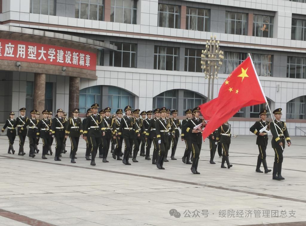 早七时,升旗仪式准时开始。学校国旗护卫队队员迈着铿锵有力、整齐划一的步伐,护卫着鲜艳的五星红旗步入广场,伴随着激昂雄壮的《义勇军进行曲》,五星红旗迎风展开,经济管理学院学生身着统一院服,神情庄重,目光坚定,面向国旗肃立,行注目礼。