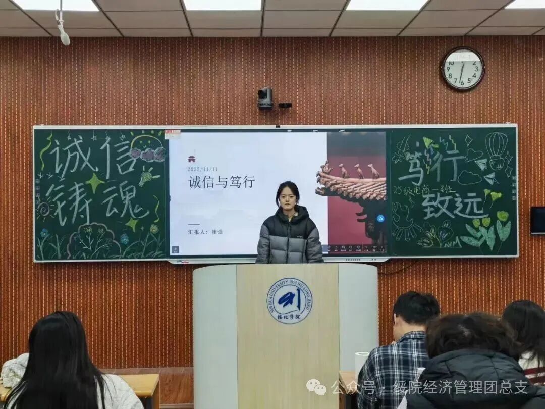 为引导经管学子深刻理解诚信的核心内涵与时代价值,筑牢道德根基,树立正确的诚信观与价值观,11月12日,经济管理学院开展“诚信铸魂,笃信致远”主题班会活动。