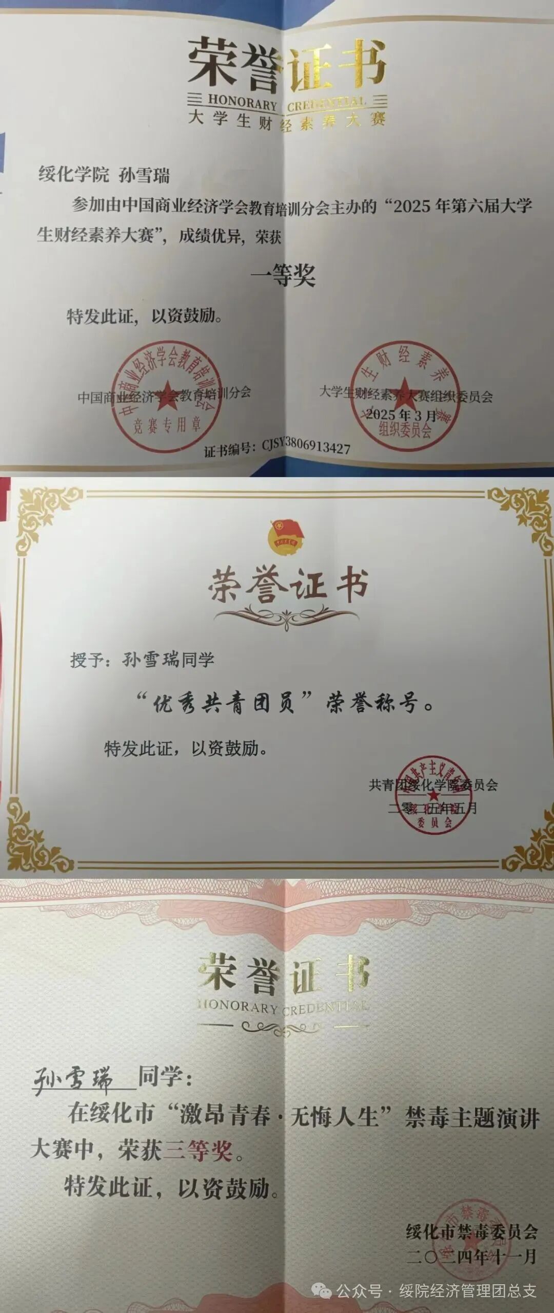 孙雪瑞,女,汉族,绥化学院经济管理学院2023级保险学2班的学生。曾荣获2023 - 2024学年校级二等奖学金、2023 - 2024学年国家励志奖学金,2025年5月“优秀共青团员”荣誉称号,2025年第六届全国大学生财经素养大赛一等奖,2024年绥化市“激昂青春·无悔人生”禁毒主题演讲比赛三等奖。