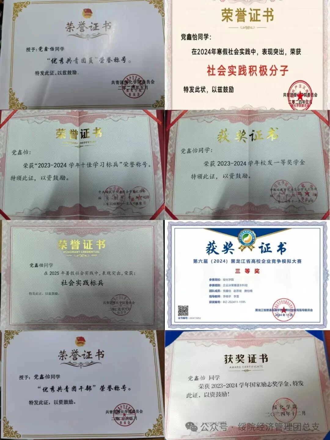 党鑫怡,女,汉族,绥化学院经济管理学院2023级电子商务专业1班学生。曾获“优秀共青团员”、“社会实践积极分子”荣誉称号,“2023-2024学年十佳学习标兵”荣誉称号,荣获第六届(2024)黑龙江省高校企业竞争模拟大赛三等奖、国家励志奖学金、校级一等奖学金,荣获绥化学院第二届团支部书记大赛二等奖,获得“优秀共青团干部”荣誉称号,获得国家励志奖学金、校级一等奖学金,荣获“社会实践标兵”、“校级三好学生”、“省级三好学生”荣誉称号。