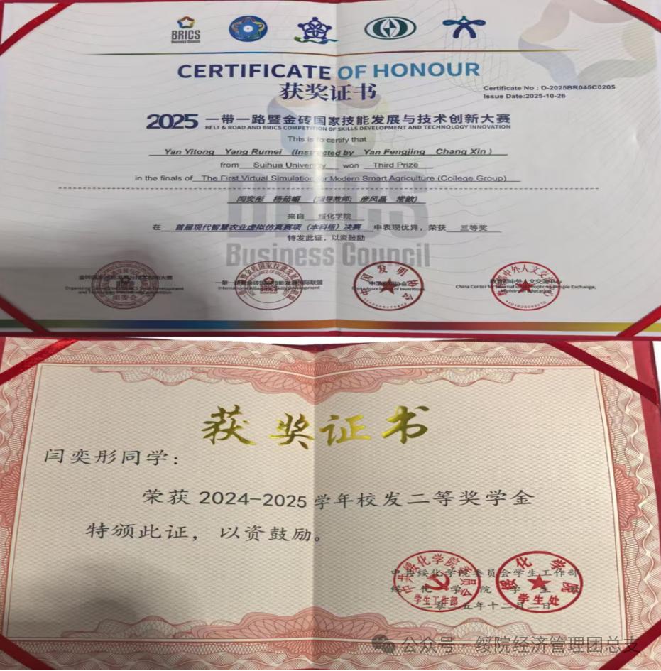 闫奕彤,女,汉族,就读于绥化学院经济管理学院2024级保险学专业2班学生。2025年上学年获得国家励志奖学金、校级二等奖学金、一带一路暨金砖国家技能发展与技术创新大赛首届现代智慧农业虚拟仿真赛项(本科组)三等奖。
