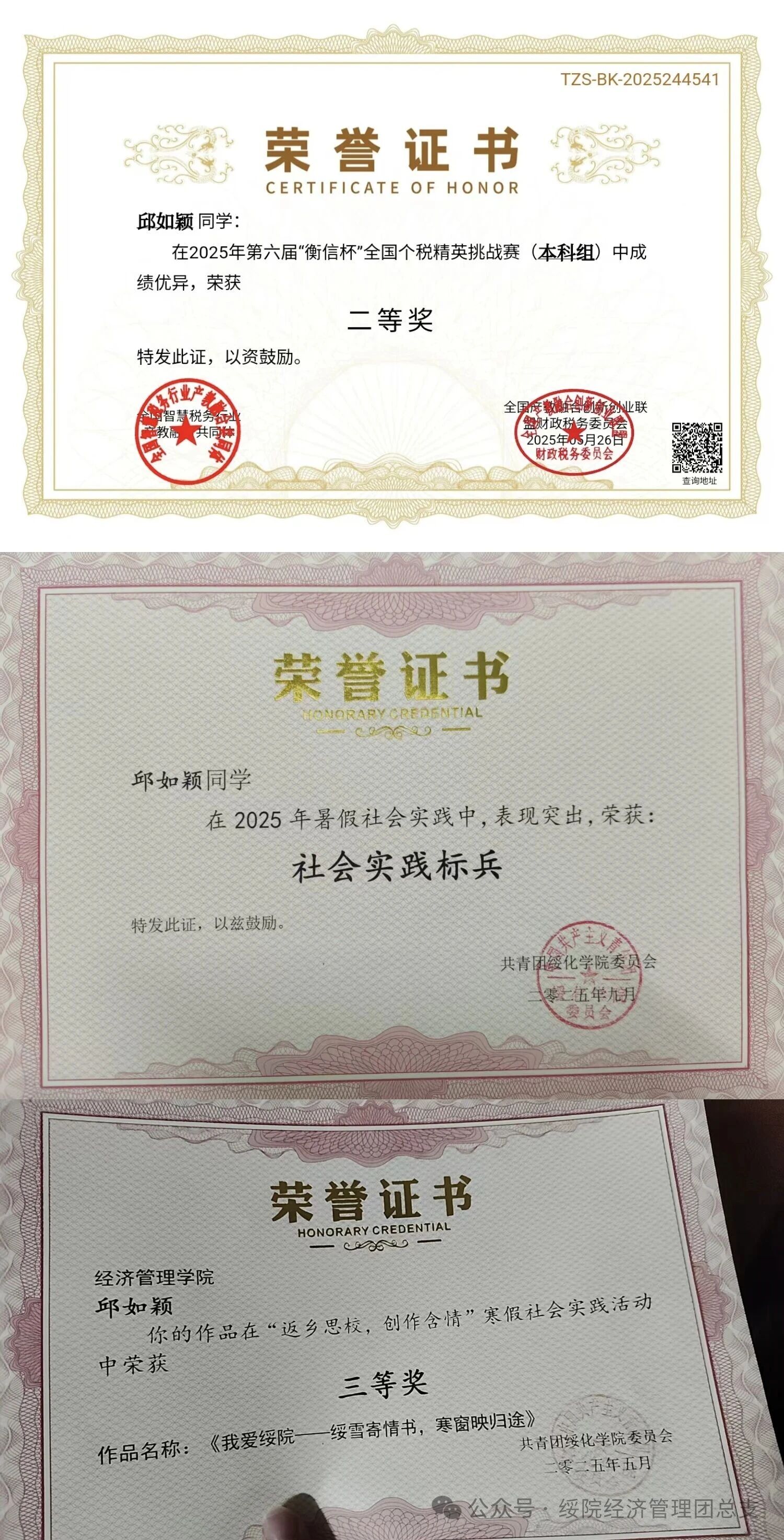邱如颖,女,汉族,就读于绥化学院经济管理学院2024级电子商务二班,曾荣获第六届“衡信杯"全国个税精英挑战赛(本科组)二等奖、2025年社会实践标兵、寒假社会实践活动三等奖。