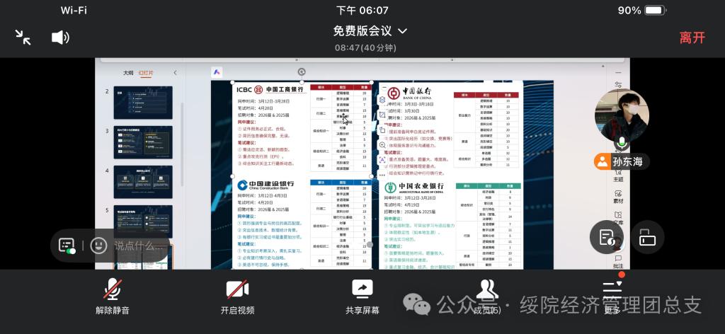 分享会上,孙东海同学首先从四大行的业务特色与招聘概况入手,清晰梳理了2026年银行春招的关键时间节点与核心岗位类型,为同学们搭建起清晰的备考框架。他着重强调,心态是贯穿求职全过程的核心要素,直接影响备考效率,提醒同学们始终保持积极向上的求职心态