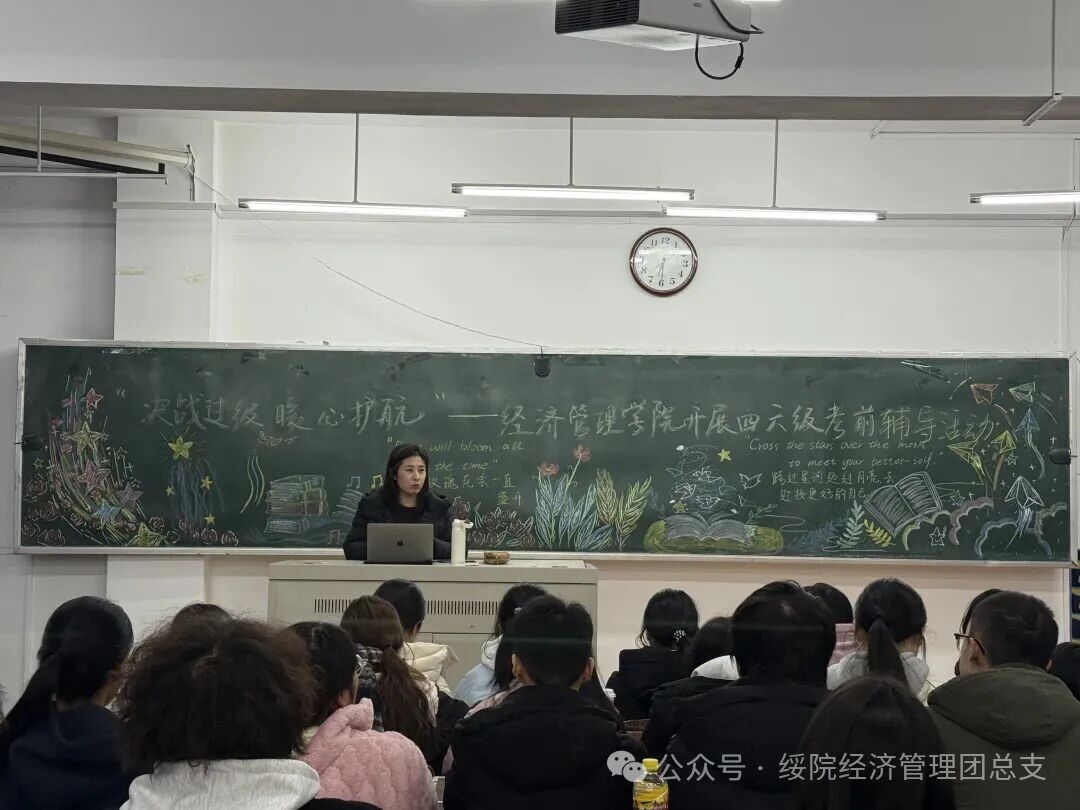 为助力经管学生探寻科学备考路径、掌握科学有效的备考学习方法,缓解备考压力,提升英语综合应用能力与考试通过率,11月24日,经济管理学院开展“决战过级,暖心护航”经英学社英语四六级考前辅导会。本次活动邀请外国语学院王弈丽老师进行考前辅导。