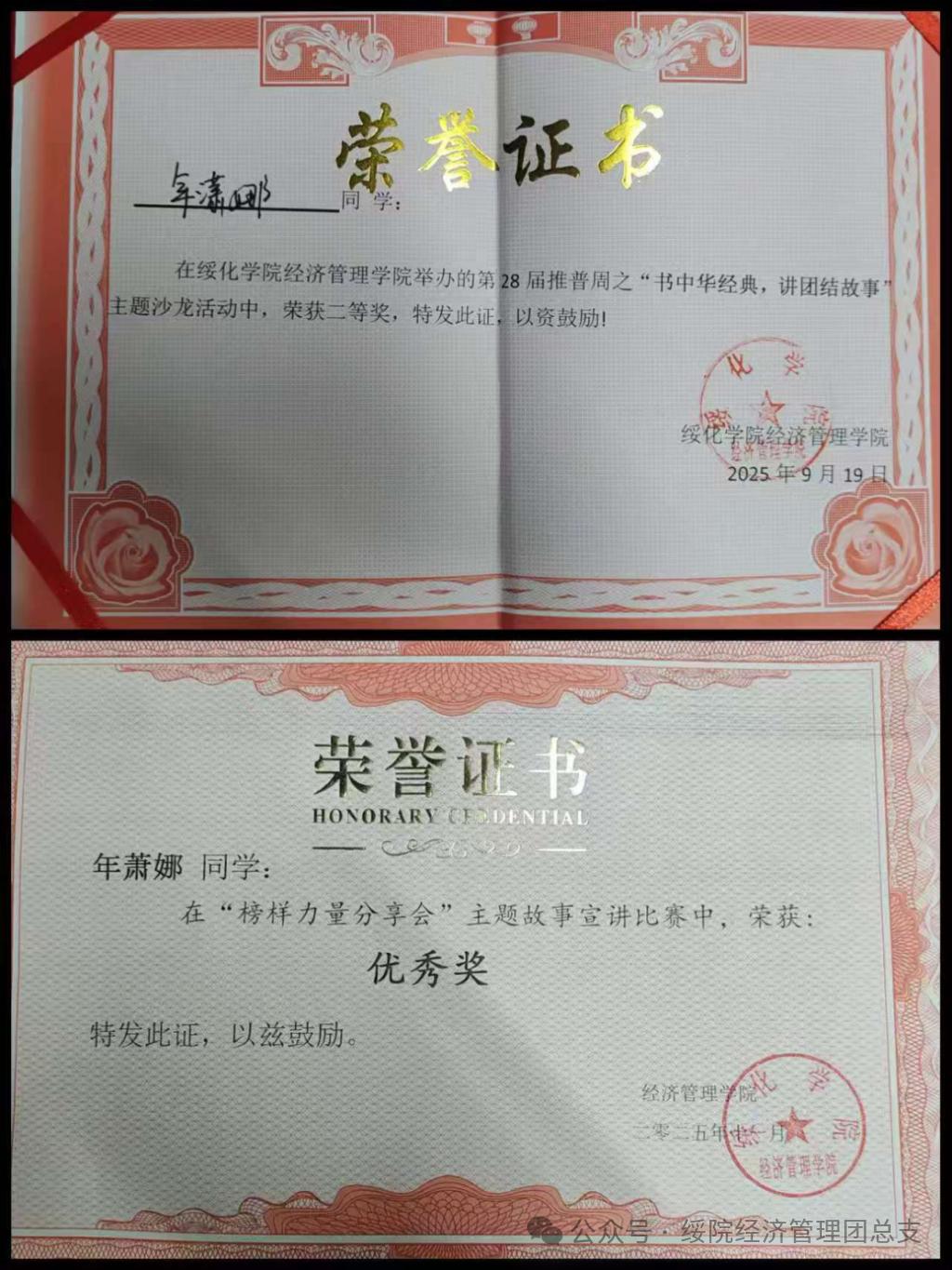 年潇娜,女,汉族,就读于绥化学院经济管理学院2024级物流管理专业一班学生。曾获2024-2025学年国家奖学金、校级一等奖学金,获评“优秀学习委员”;在“书中华经典,讲团结故事”主题沙龙活动中获二等奖、“榜样力量分享会”主题宣讲活动中获优秀奖、读书笔记活动中获三等奖。
