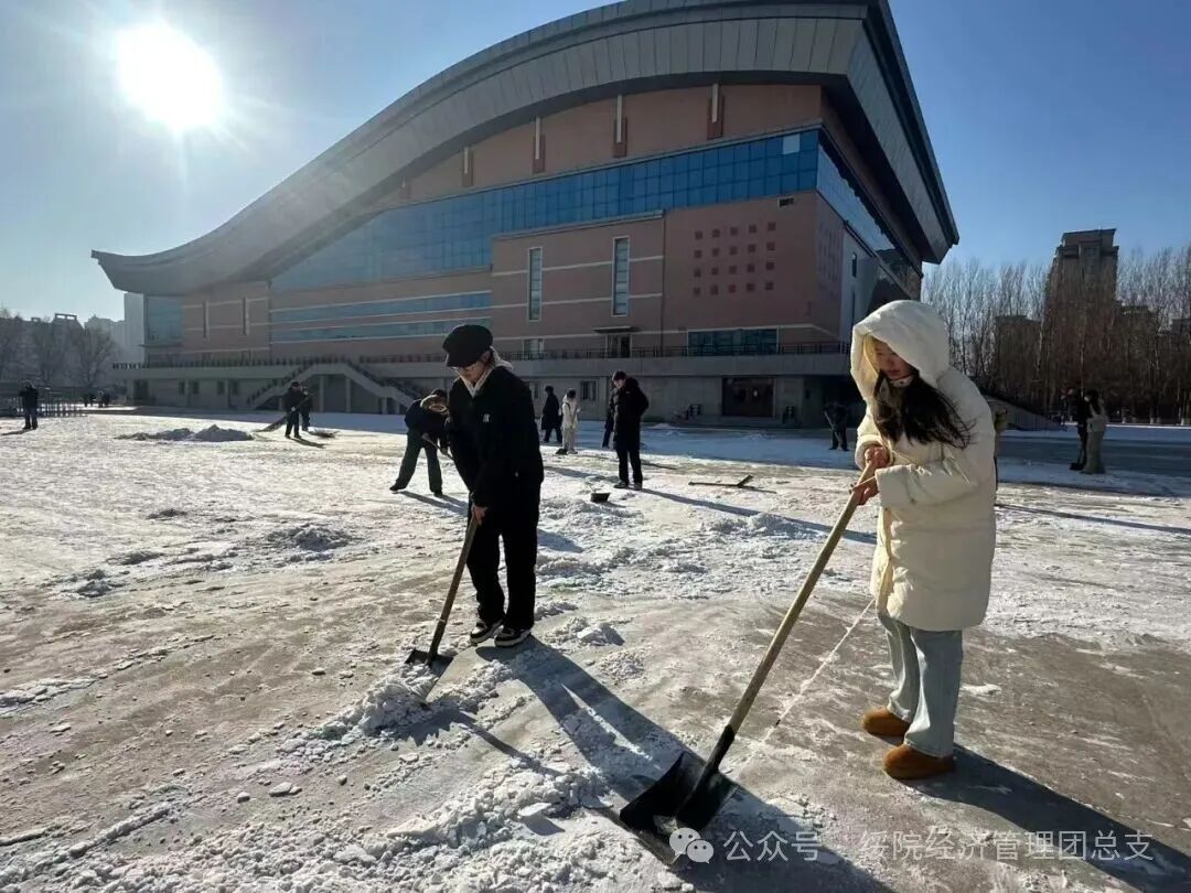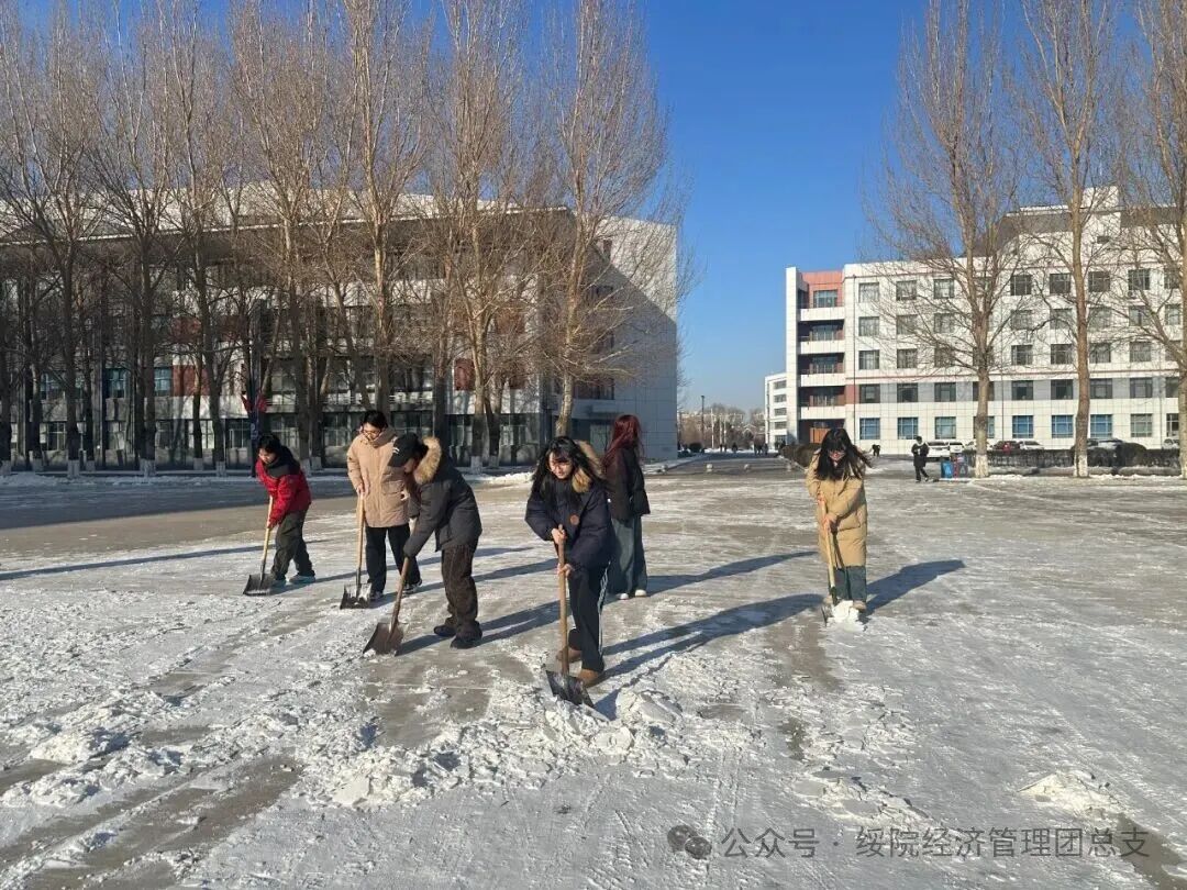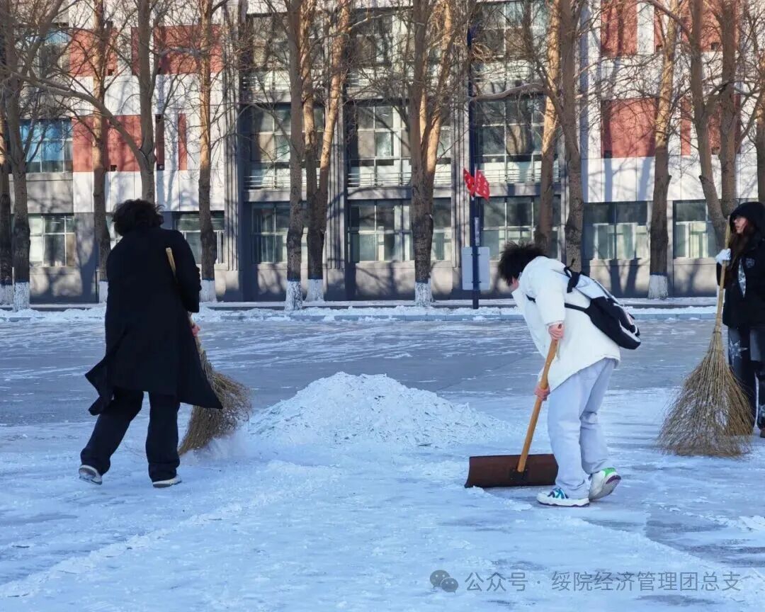 同学们分工明确、默契配合,手持铁锹、扫帚、除雪铲等工具进行清雪除冰,为全校师生们清扫出一条“暖心路”,尽管天气寒冷,但大家的热情丝毫未减,每个人都全力以赴,用实际行动诠释了经管学子们的责任与担当,展现出当代青年的良好精神风貌。