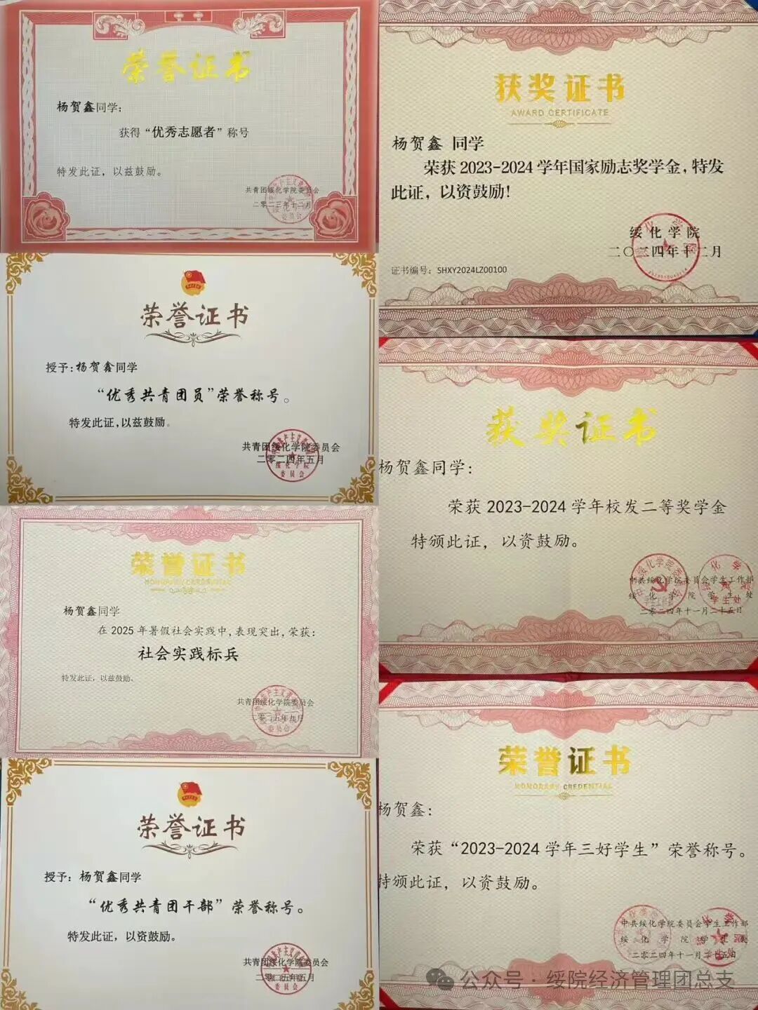 在学习上,杨贺鑫同学始终以精益求精的态度投入学业,课堂专注钻研、课后拓展积累,学业成绩始终稳居专业前列,积累扎实的专业知识。