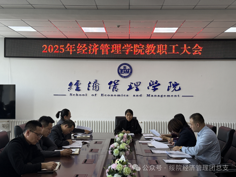 1月4日,经济管理学院在汇文楼413会议室召开2025年度教职工大会。学院领导班子及全体教职工参加会议,会议由工会主席罗晓宇主持。