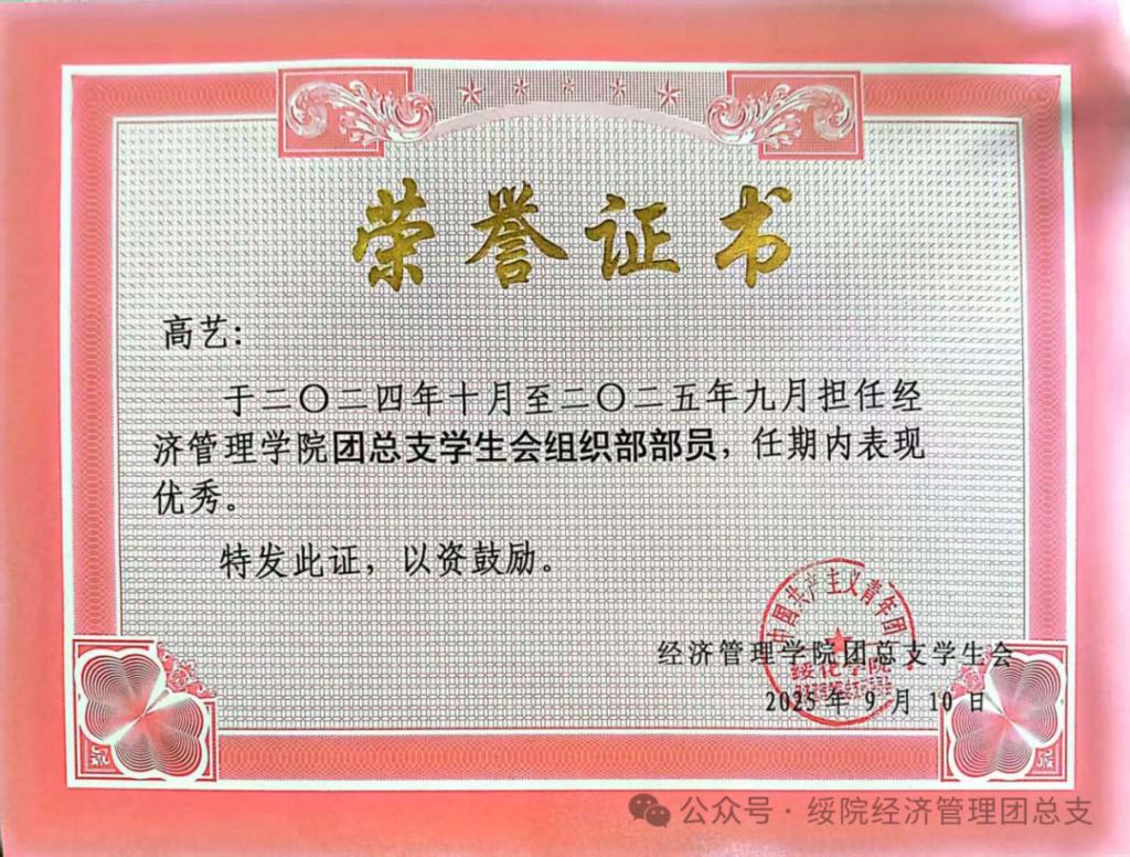 高艺,女,满族,就读于绥化学院经济管理学院2024级市场营销二班,担任经济管理学院组织部副部长。曾在2025年上学年获经济管理学院“耀梦扬风采,经彩筑华章”迎新晚会优秀奖,2025下学年获得“社会实践标兵”荣誉称号,荣获校级一等奖学金;“感恩于心,诚信于行”演讲比赛三等奖,“青春飞扬、筑梦中华”五四歌会优秀奖,“优秀共青团员”荣誉称号,“三·二五”系列活动二等奖;“三好学生”荣誉称号。